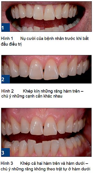 Tại một cơ sở nha khoa, bệnh nhân nam 50 tuổi đã trình bày rằng ông ta không hài lòng về thẩm mỹ của răng mình (Hình 1). Nhìn chung, bệnh nhân không hài lòng về màu vàng ố của răng và khe hở khớp cắn giữa hàm trên và hàm dưới. Hình ảnh đầu tiên mô tả một vài vấn đề về thẩm mỹ của răng. Cạnh cắn của răng cửa hàm trên có những sai lệch mức độ khác nhau (Hình 2). Điều này là do răng cửa hàm trên bên trái dài và có dấu hiệu mòn rõ rệt. Cũng vì thế, khi răng nanh mọc xen vào làm mất đi đường viền sinh học của răng. Vị trí của môi trên và đường nụ cười thể hiện hài hoà và chính xác đường kẻ giữa ở hàm trên, trong khi những răng dưới mọc không theo thứ tự (Hình 3). Có dấu hiệu tụt nướu nhiều ở vùng răng thẩm mỹ, ngoại trừ những răng cửa hàm trên bên trái. Răng 11, 21 và 22 bị lệch góc so với hàm. Răng cửa mọc chen chút ở hàm dưới lộ phần đỉnh và viền răng. Tuy bệnh nhân không gặp những vấn đề gì về chức năng ăn nhai và không có sự khác biệt giữa điểm trung tâm lõi cầu (centric condylar position) và điểm tối đa vị trí nhai hàm dưới (habitual intercuspation). Mặc dù vậy, những răng dưới thực sự cần chỉnh nha. Xét về chức năng ăn nhai, sự tiêu hao ở răng nanh phần môi cần được phục hình để tái tạo lại đường cắn tự nhiên của răng nanh.
