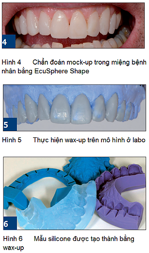 Một bước rất quan trọng – xác định được những mong muốn của bệnh nhân và chứng minh được tính khả thi của ca lâm sàng – là mô phỏng kết quả thẩm mỹ trực tiếp trong miệng bệnh nhân. Trong trường hợp này, EcuSphere Shape (DMG) được sử dụng (không cần bonding) để tạo hình dáng sơ khởi của kết quả phục hình tối ưu. Độ đồng nhất của vật liệu composite này có thể giúp cho tạo hình rất nhanh nhờ vào đầu bơm và cây tạo hình. Trước hết, tạo đường viền ở phía môi để hình dung đường cười của bệnh nhân. Sau khi quang trùng hợp, vùng răng cửa vòm miệng được mô phỏng với khớp cắn tĩnh và động. Trong trường hợp này, việc hình thành đường viền vùng răng trước thì không thực sự cần thiết ở bước này, bởi vì trong bước thứ hai, hàm dưới được điều chỉnh hài hoà bằng liệu pháp chỉnh nha và gắn verneer. Việc tạo hình (morphing) được thực hiện ở răng tiền cối đầu tiên bên phải hàm dưới đến răng tiền cối đầu tiên bên trái để tạo sự hài hoà xung quanh hàm (Hình 4). Tiến hành điều chỉnh, loại bỏ các phần thừa của mock-up trực tiếp với đĩa mài giấy thổi cát. EcuSphere Flow (DMG) dùng cho vùng cần tái tạo lại viền để hoàn tất bước cuối cùng của quá trình thiết kế thẩm mỹ. Kết quả thẩm mỹ được xác nhận lại với bệnh nhân. Sau những thay đổi nhỏ, kết quả mô phỏng ở lần đầu tiên đã làm hài lòng nha sĩ và quan trọng hơn là hài lòng yêu cầu thẩm mỹ của bệnh nhân. Quá trình mô phỏng trong miệng được ghi nhận bằng hình ảnh chụp trên camera. Một mẫu dẫu mock-up trực tiếp đưa cho kỹ thuật viên với đầy thông tin nhất có thể. Hiện giờ, các kỹ thuật viên đã có đủ các thông tin liên quan cho bước wax-up cuối cùng. Trong khi đó, răng hàm dưới cũng đã được sắp xếp, điều chỉnh bởi các bác sĩ chỉnh nha.