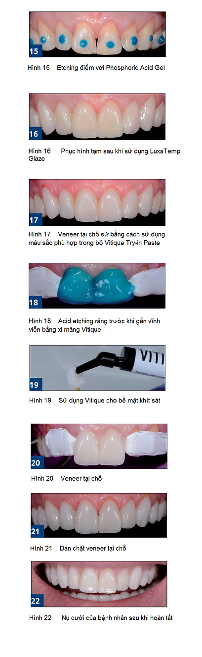 Veneer được etching bằng hydrofluoric acid 5% và silane bằng Vitique Silane (DMG) để tăng cường độ bền dán. Phần sửa soạn được xử lý bề mặt 20 giây bằng phosphoric acid 37% và tăng độ bền dán với TECO (DMG). Sử dụng keo dán quét lớp mỏng và thổi khí trong vòng 5 giây. Những răng cửa ở giữa hàm trên được điều chỉnh đồng thời để đảm bảo vị trí được cân đối. Những răng xung quanh được bảo về bằng Teflon tape.
